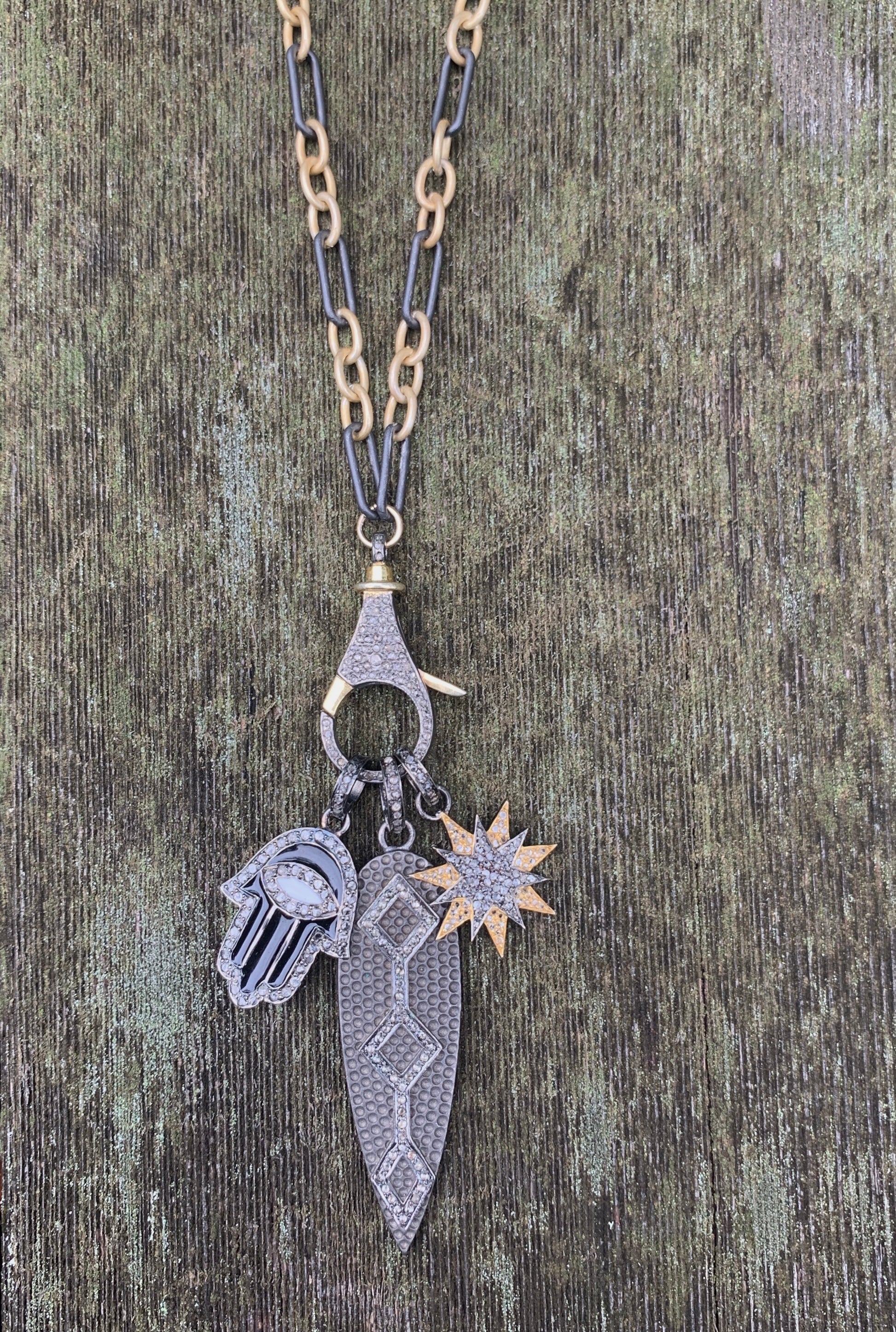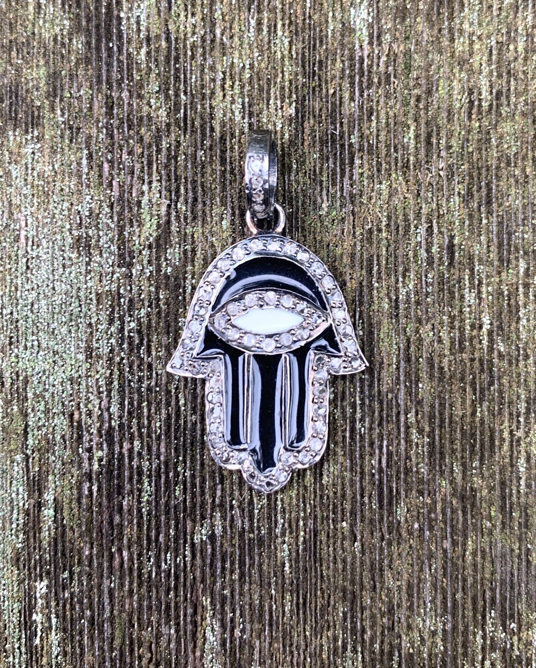 Black enamel Hamsa with pave diamonds and white enamel accent, wear alone or coupled with your favorite charms
