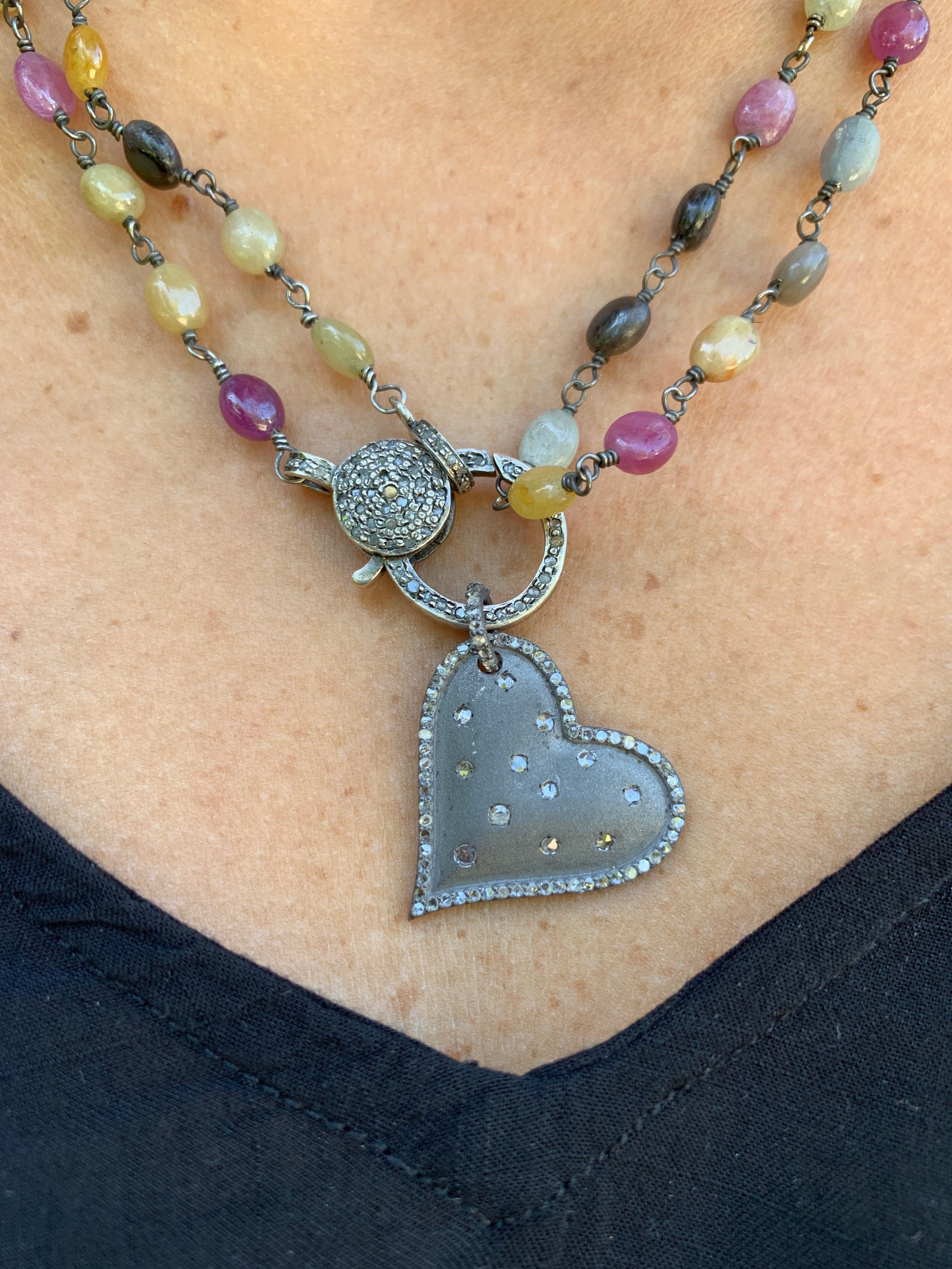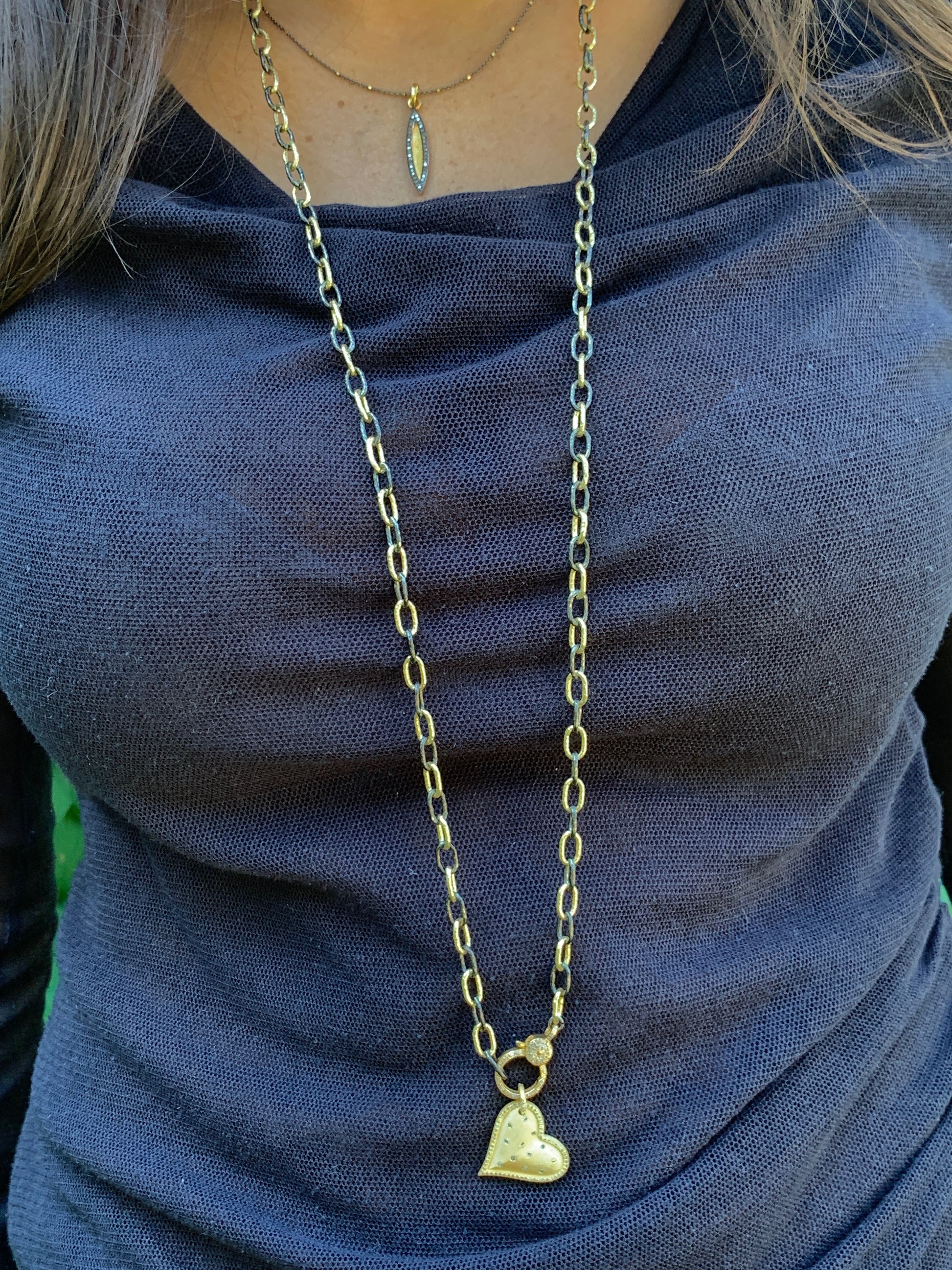 Oxidized sterling silver heart charm with scattered diamonds and diamond halo hanging off-center on pavé bale. Also available in gold vermeil. 28 x 25mm